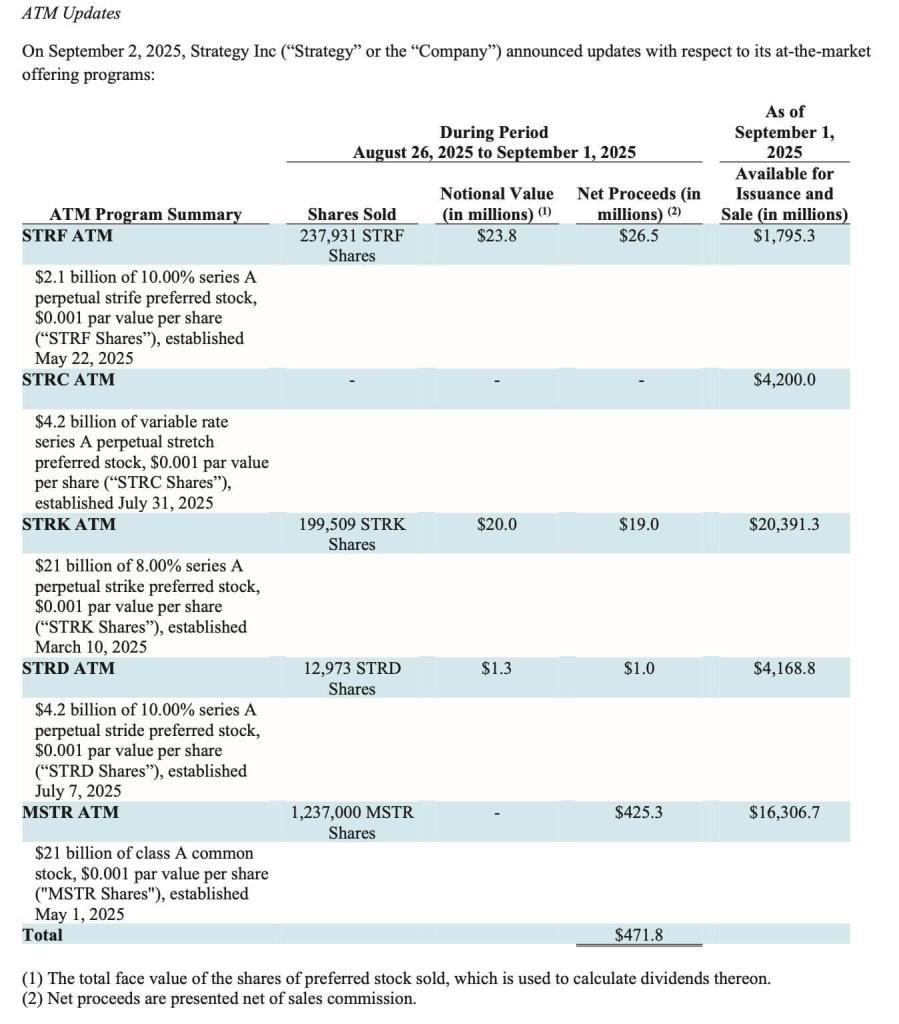 According to the filing, Strategy sold 1.24 million shares of its Class A common stock for $425.3 million. The company raised the $46.5 million balance through its preferred share programs, including STRK, STRF, and STRD.